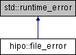 Inheritance diagram for hipo::file_error:Exception thrown for HIPO file I/O errors (e.g., file not found, read failure).