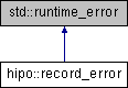 Inheritance diagram for hipo::record_error:Exception thrown for record-related errors (e.g., decompression failure).